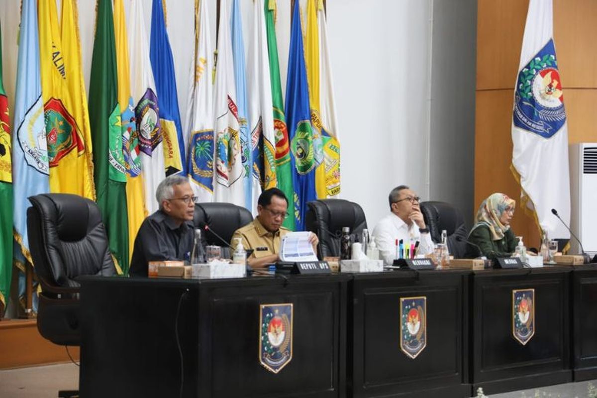 Mendagri Muhammad Tito Karnavian saat memimpin Rapat Koordinasi Pengendalian Inflasi Daerah di Gedung Sasana Bhakti Praja (SBP) Kantor Pusat Kementerian Dalam Negeri (Kemendagri), Kecamatan Gambari, Jakarta Pusat. Sementara di tingkat kota, Prabumulih, Bontang, Lubuk Linggau, serta Denpasar berhasil mencatatkan realisasi pendapatan tertinggi.