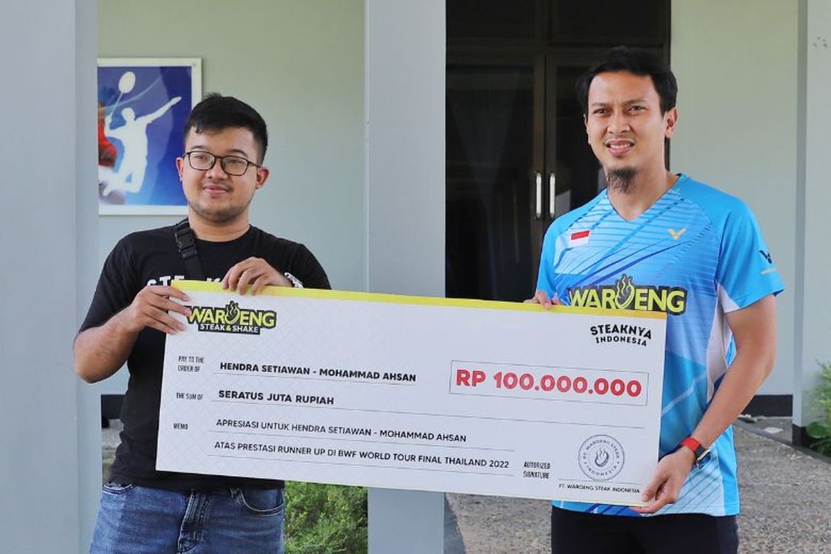 KOMPAS.com – Komisaris PT Waroeng Steak Indonesia Yuga Adhyaksa memberikan bonus sebesar Rp 100 juta untuk pebulu tangkis ganda putra Mohammad Ahsan dan Hendra Setiawan.