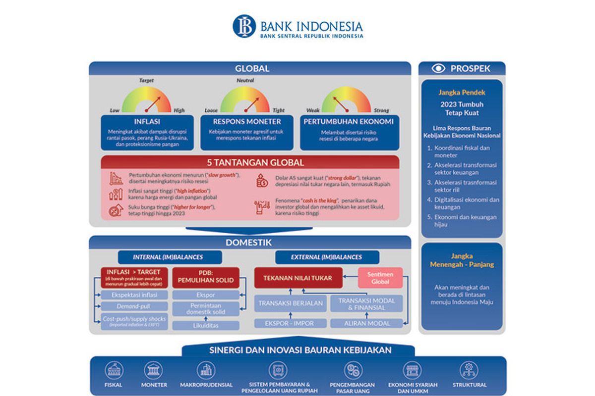 Untuk 2023, BI berfokus pada kebijakan yang diarahkan untuk memperkuat ketahanan serta mempercepat pemulihan dan kebangkitan perekonomian dalam sinergi yang erat dengan kebijakan ekonomi nasional.
