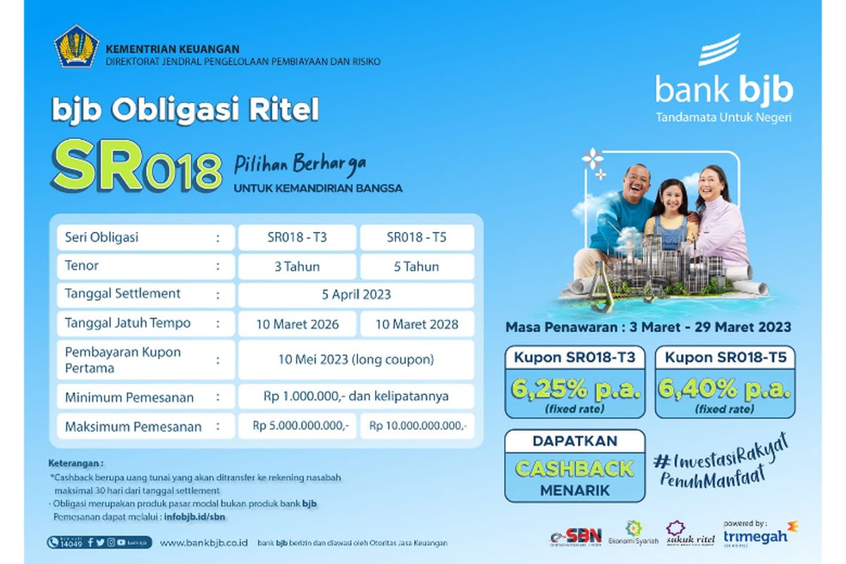 “Bank BJB terus berupaya membantu pemerintah melalui penawaran SR018. Tujuannya, agar masyarakat bisa dengan mudah berinvestasi dan membantu kemandirian bangsa," tuturnya dalam keterangan pers yang diterima Kompas.com, Kamis (9/3/2023).