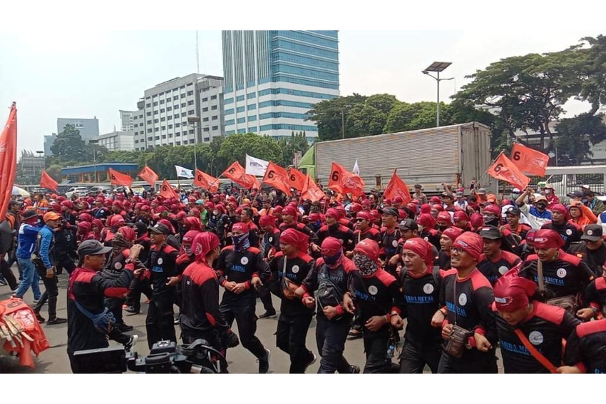 KOMPAS.com - Ribuan anggota Partai Buruh dan sejumlah serikat buruh berunjuk rasa di di depan Gedung DPR MPR RI, Jakarta Pusat, Senin (13/3/2023).
