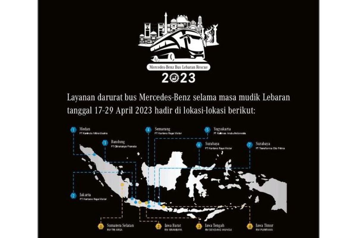 KOMPAS.com – Daimler Commercial Vehicle Indonesia (DCVI) atau Daimler Truck Indonesia kembali mengadakan program Lebaran Rescue 2023, mulai dari Senin (17/4/2023) hingga Sabtu (29/4/2023). Program ini diadakan untuk memberikan layanan 24 jam melalui fasilitas dan servis bus Mercedes-Benz demi keamanan berkendara selama mudik Lebaran.