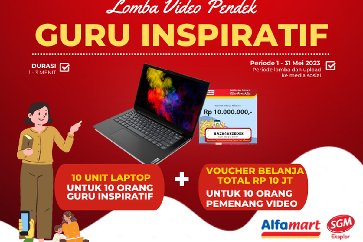 KOMPAS.com – Alfamart bersama SGM Eksplor menggelar lomba video pendek guru inspiratif dengan hadiah laptop dan uang tunai sebagai peringatan Hari Pendidikan Nasional (Hardiknas) 2023.