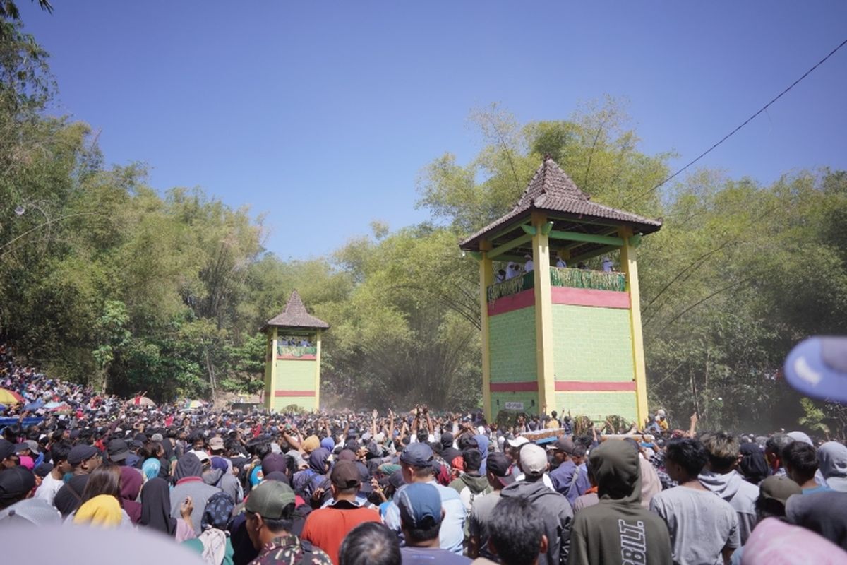 KOMPAS.com – Tradisi Saparan Yaqowiyu di Jatinom, Kabupaten Klaten, Jawa Tengah, mencapai puncaknya pada Jumat (1/9/2023). Ribuan warga dari berbagai daerah memadati Alun-alun Sendang Plampeyan yang menjadi lokasi acara untuk mendapatkan apam yang dibagikan secara gratis.