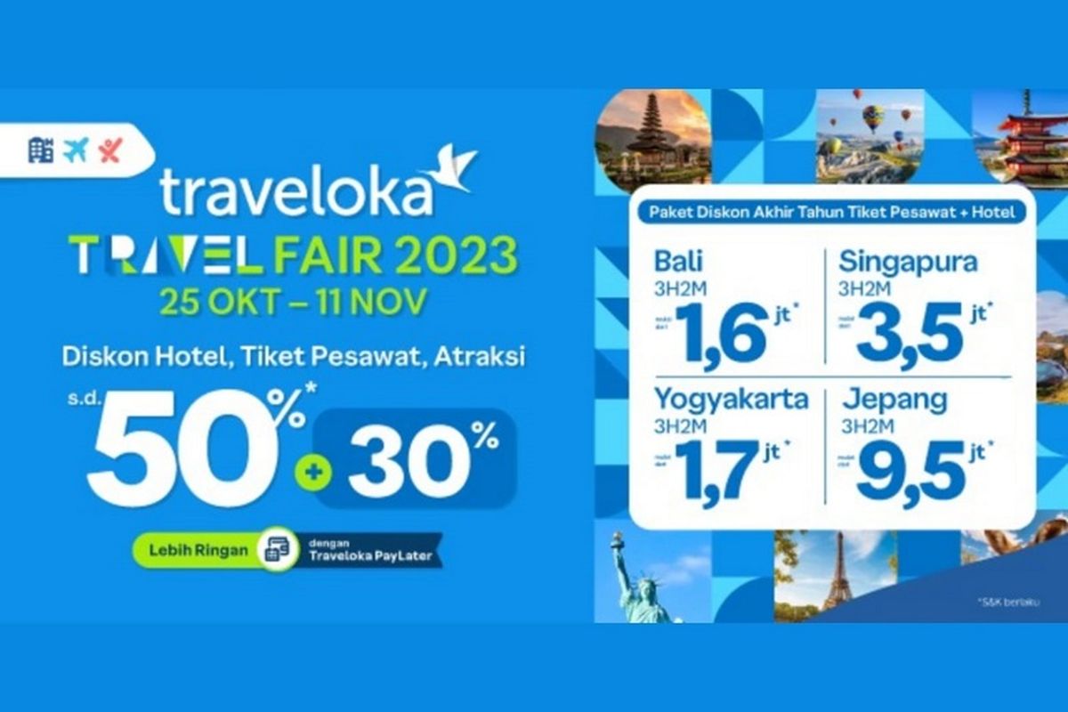Jika sudah punya rencana berlibur ke Jateng, Anda bisa memanfaatkan Traveloka Travel Fair. Program tersebut menawarkan diskon hotel hingga 50 persen plus 30 persen dan penawaran menarik, mulai dari tiket pesawat hingga paket wisata. Adapun program ini berlangsung mulai Rabu (25/10/2023) hingga Sabtu (11/11/2023).