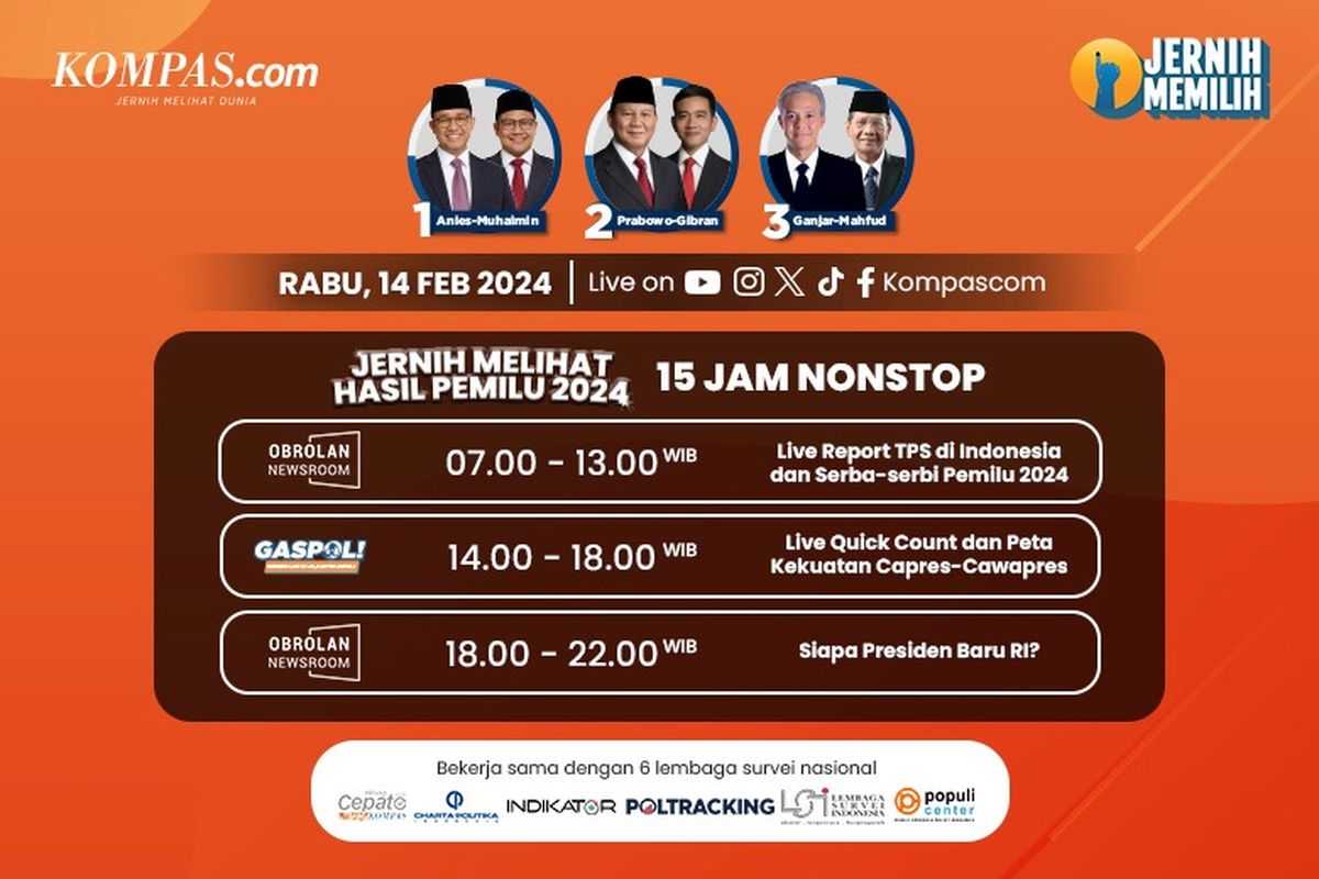 Siaran langsung hitung cepat tersebut bisa ditonton langsung di situs Kompas.com ataupun Youtube, Instagram, Tiktok, Facebook, dan Twitter milik Kompas.com.