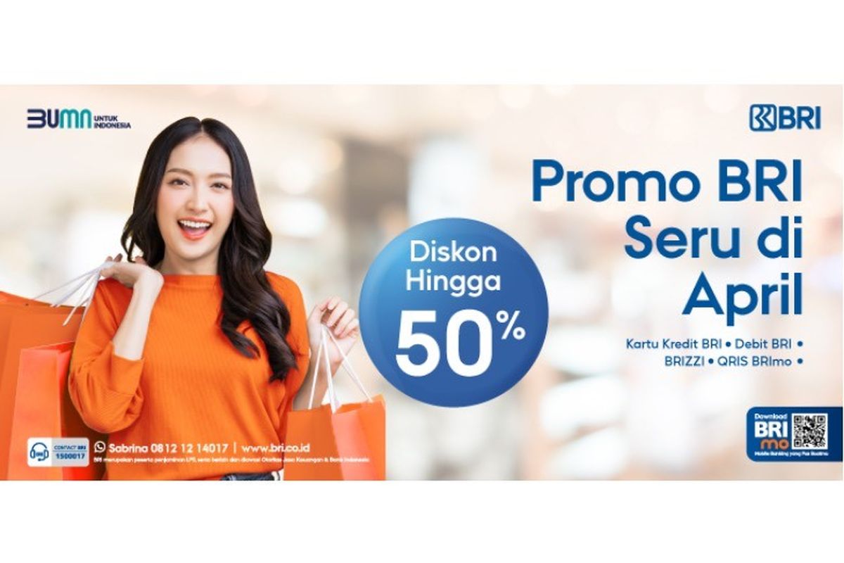 Agar self-reward bisa hemat, kamu bisa manfaatkan Promo BRI Seru di April yang menawarkan diskon hingga 50 persen untuk transaksi menggunakan Kartu Kredit BRI, Debit BRI, BRIZZI, dan QRIS di BRImo. Keuntungan tersebut berlaku di berbagai merchant rekanan BRI yang tersebar di seluruh Indonesia.