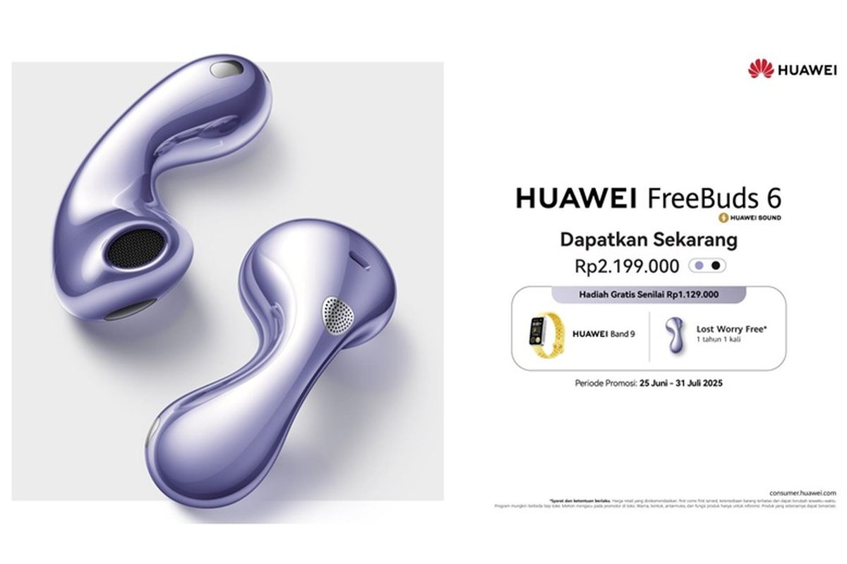 HUAWEI FreeBuds 6 bisa didapatkan dengan harga khusus senilai Rp 2.199.000. Selama sesi first sale yang dimulai pada Rabu (25/6/2026), pelanggan akan mendapatkan gratis HUAWEI Band 9 dan garansi kehilangan selama satu tahun.