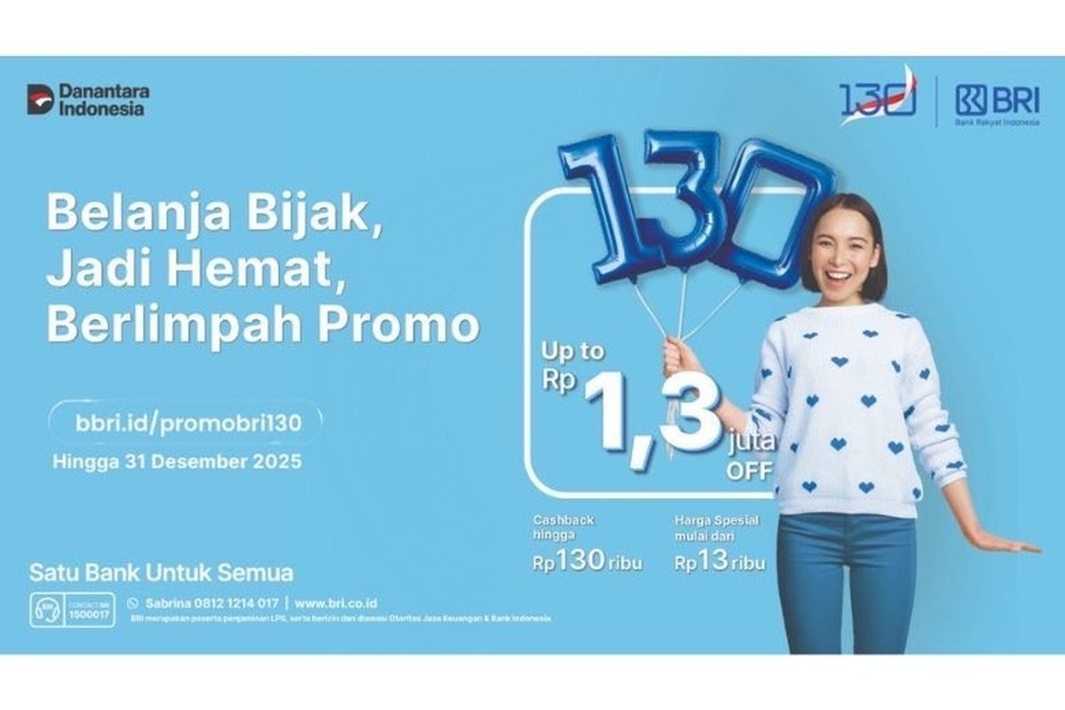KOMPAS.com - Memasuki usia ke-130 tahun, PT Bank Rakyat Indonesia (Persero) Tbk atau BRI memperkuat komitmennya untuk memberikan nilai tambah bagi nasabah melalui berbagai program promo nasional bertajuk “Belanja Bijak, Jadi Hemat, Berlimpah Promo”.