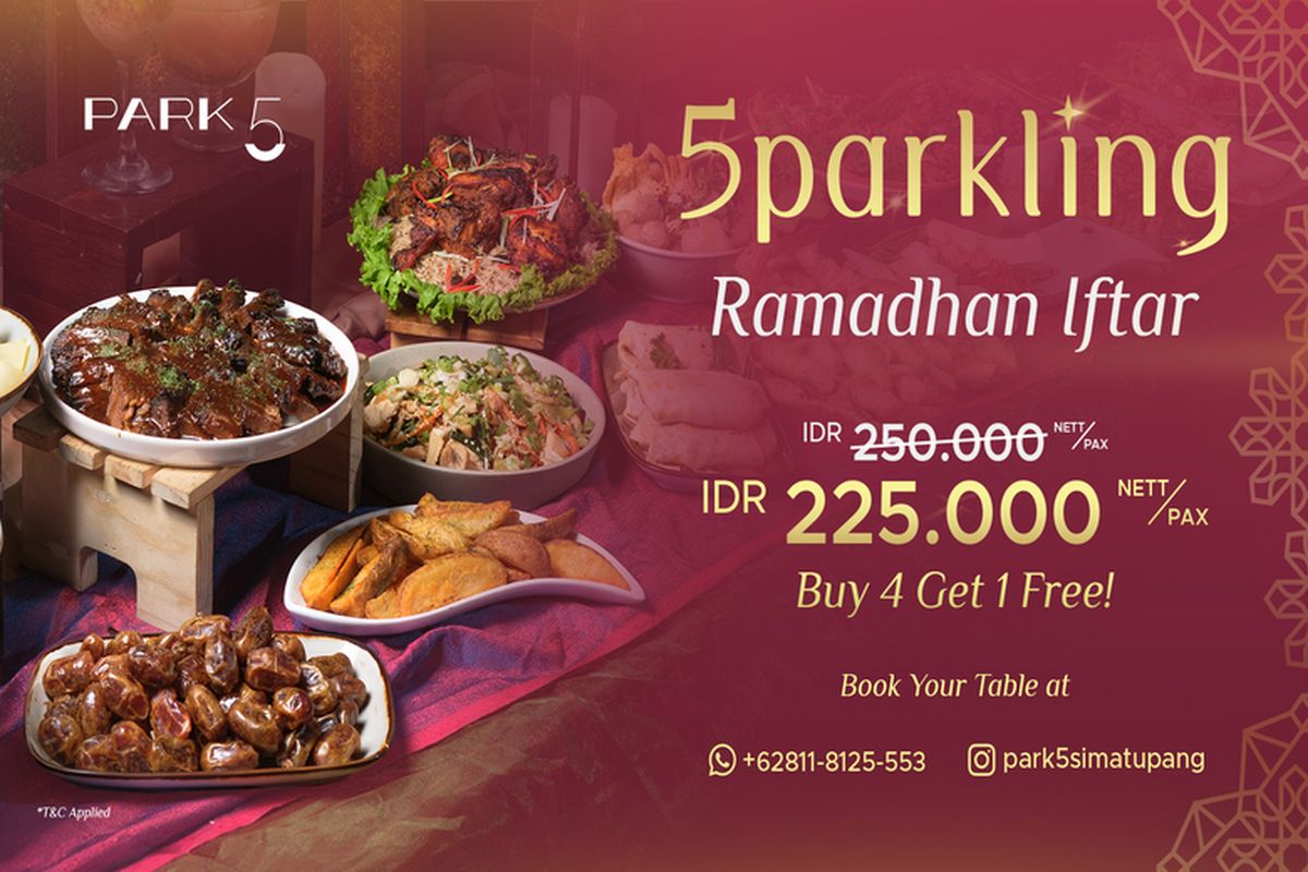 Sebagai informasi, paket 5Parkling Ramadhan Iftar menyediakan kapasitas hingga 250 pax dengan pilihan area indoor, outdoor, dan private room sehingga cocok untuk berbagai kebutuhan berbuka puasa.