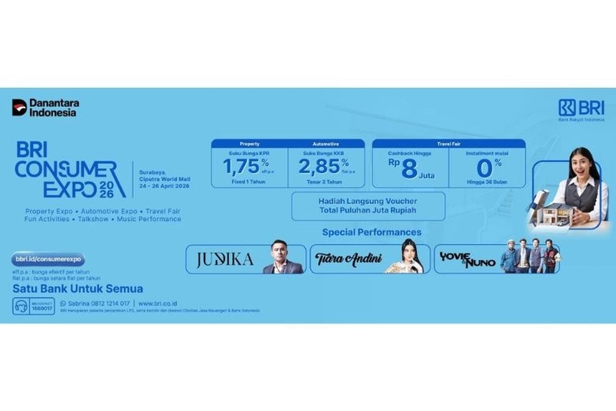 KOMPAS.com – PT Bank Rakyat Indonesia (Persero) Tbk atau BRI menggelar BRI Consumer Expo 2026 sebagai solusi lengkap bagi masyarakat yang ingin memiliki hunian di Ciputra World Mall Surabaya, Jawa Timur, mulai Jumat (24/4/2026) hingga Minggu (26/4/2026).